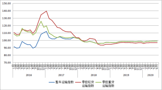 分车型指数看,各车型指数环比均有所回升,其中零担轻货指数较为平稳,同比继续涨跌互现。以大宗商品及区域运输为主的整车指数为99.0点,比上月回升0.04%,比上年同期回升0.7%,呈现持续回升态势。零担指数中,零担轻货指数为96.8点,与上月基本持平,比上年同期回落0.02%;零担重货指数为99.0点,比上月回升0.05%,比上年同期回升0.7%。