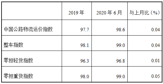 2020年6月份,由中国物流与采购联合会和林安物流集团联合调查的中国公路物流运价指数为98.6点,比上月略微回升0.04%,比去年同期增长0.5%。从各周指数看,第一、三周运价指数环比小幅回升,第二、四周指数环比小幅回落。
