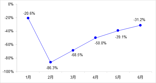 上半年,完成营业性客运量39.6亿人,同比下降54.8%,6月已恢复至去年同期的56.3%,恢复程度较一季度末提高29.3个百分点。分方式看,公路客运量下降55.0%、水路客运量下降56.7%。