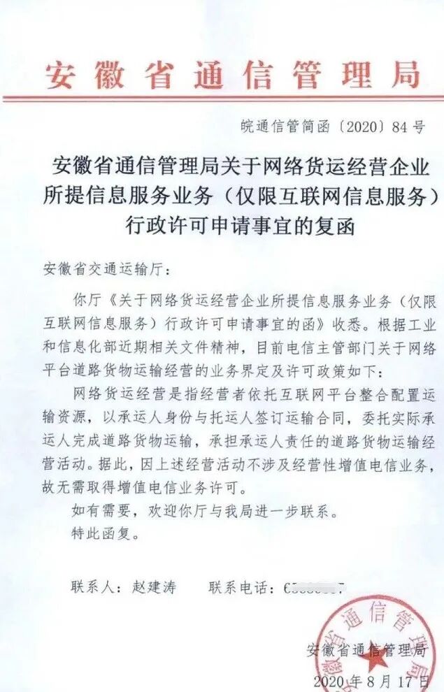 近日,安徽省通信管理局发布关于网络货运经营企业所提信息服务业务(仅限互联网信息服务)行政许可申请事宜的复函,目前电信主管部门关于网络平台道路货物运输的业务界定及许可证政策如下: