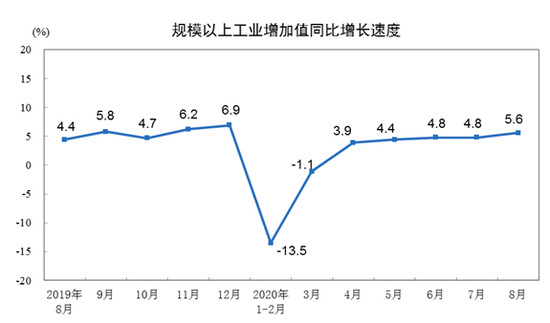 国家统计局近日发布数据显示,8月,全国规模以上工业增加值同比增长5.6%,较上月加快0.8个百分点,增速已接近上年平均水平;1-8月,工业增加值同比增长0.4%,而1-7月为下降0.4%,累计增速实现由负转正,工业生产复苏态势持续巩固。