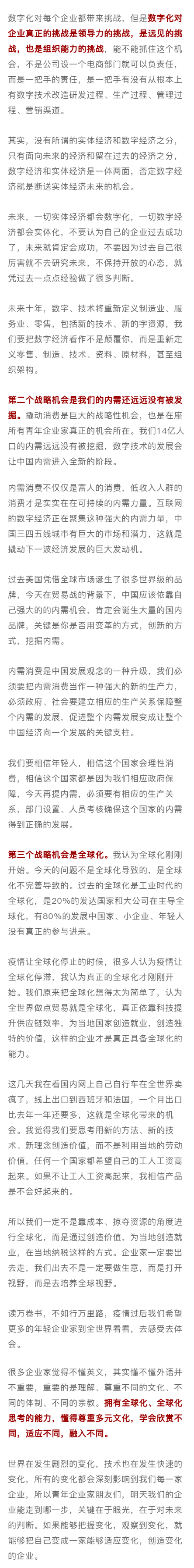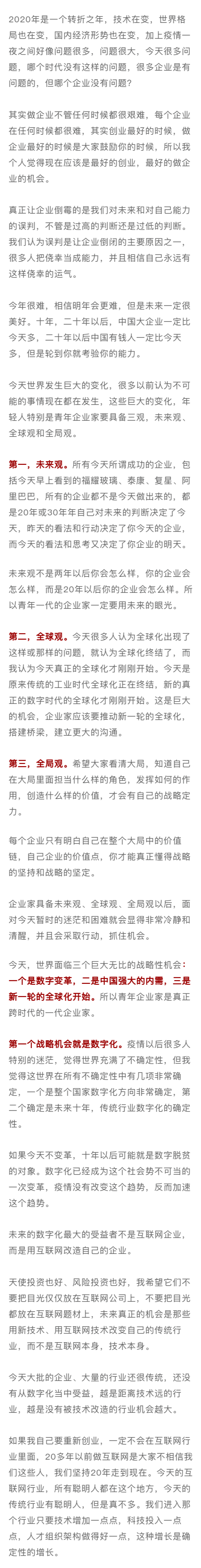 在他看来,现在是最好的创业、做企业的机会。所谓成功的企业,都不是今天做出来的,都是20年或30年前对未来的判断决定了今天,“所以,一定要用未来的眼光解决今天的问题。”