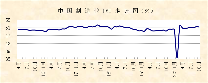 10月份中国制造业采购经理指数(PMI)为51.4%,较上月小幅下降0.1个百分点,连续4个月运行在51%及以上,经济继续保持稳定复苏态势。分项指数变化显示,市场需求增长态势较为稳定,企业生产活动保持平稳,进出口继续改善,高端制造业持续快速增长。当前值得关注的问题是原材料购进价格过快上涨以及消费品需求增速短期放缓。