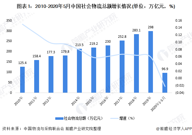 物流业是我国国民经济的重要组成部分,2019年,在全球经济增长持续放缓,经济下行压力加大,我国物流运行保持总体平稳、稳中有进的运行态势,物流需求规模不断扩大,数据显示,2019年,我国社会物流总额达到298.0万亿元,同比增长5.9%;2020年1-5月,全国社会物流总额96.9万亿元,按可比价格计算,同比下降2.2%,降幅比1-4月份收窄2个百分点,连续三个月降幅收窄。