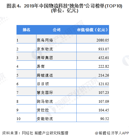 在企业竞争格局方面,由于智慧化技术手段是智慧物流企业的核心竞争力之一,根据网经社发布的“2019年中国物流科技“独角兽”公司榜单”,菜鸟网络、京东物流和满帮集团在我国智慧物流行业中的竞争力较强,其市值/估值分别为2080.05亿元、933.07亿元和452.61亿元。
