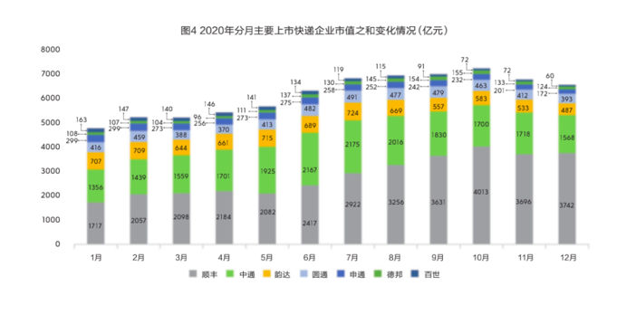 2020年,受快递逆势增长影响,资本市场十分看好快递板块,顺丰以137.2%涨幅居前,其次是中通(+24.9%),再次为德邦(+14.2%)。顺丰、中通市值均创上市以来历史新高,快递板块市值之和最高超过7000亿元,较2020年初新增近3000亿元,顺丰市值超过4000亿元,占快递板块的一半以上,中通市值占剩余的一半以上。