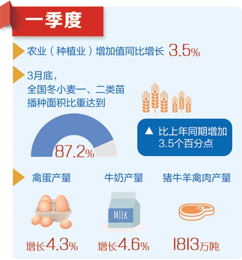 一季度,各地区各部门持续抓好粮食生产,狠抓落实生猪稳产保供政策举措,夏粮长势总体较好,生猪存栏连续两个季度恢复增长。