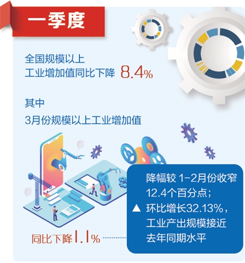 工业生产降幅明显收窄。一季度,规模以上工业增加值同比下降8.4%,降幅较前两个月收窄5.1个百分点。尤其是3月份,工业增加值同比下降1.1%,降幅较前两个月收窄12.4个百分点,工业产出规模已接近上年同期水平。