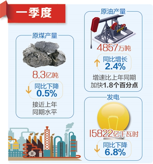 油气生产保持较快增长。油气生产企业加大供应力度,积极释放优质产能。一季度,原油产量4857万吨,同比增长2.4%,增速比上年同期加快1.8个百分点。