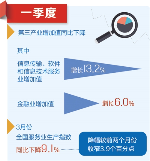现代服务业稳定增长。一季度,信息传输、软件和信息技术服务业,金融业增加值同比分别增长13.2%和6.0%,合计拉动服务业增加值增长1.2个百分点。