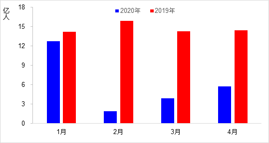 4月,完成营业性客运量5.7亿人,恢复至去年同期的39.8%,恢复程度较3月提高12.8个百分点,其中公路营业性客运量下降58.8%、水路客运量下降61.8%。