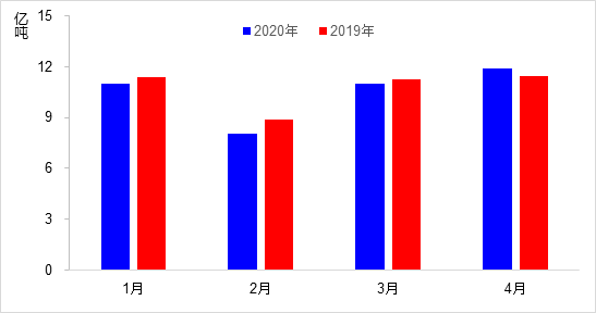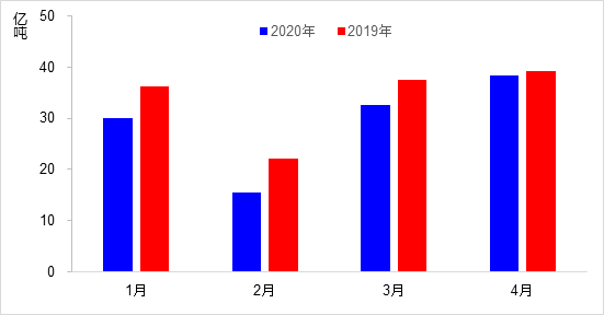 4月,完成货运量38.5亿吨,恢复至去年同期的97.9%,恢复程度较3月提高11.0个百分点,其中公路货运量下降1.4%、水路货运量下降4.8%。