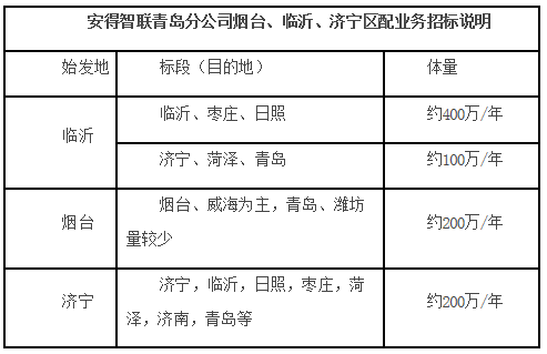 结合青岛分公司业务发展需要,为有效提高货物运输质量、保证物流服务水平、降低配送成本,选择有实力的合作伙伴长期合作,安得智联青岛分公司现拟定于2020年11月26日组织青岛分公司烟台、临沂、济宁家电区配业务招标工作。现就招标有关事宜予以公告,竭诚欢迎国内符合要求的物流企业参加投标,具体招标事项如下: