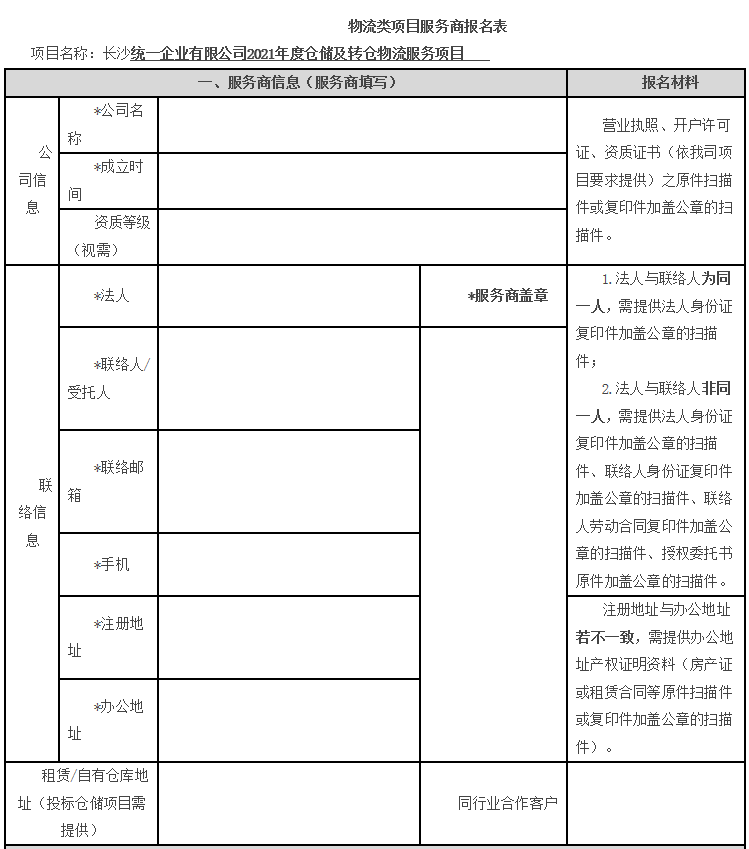 长沙统一企业有限公司针对2021年仓储及转仓物流服务项目 招标,公开征集符合如下要求的物流服务商伙伴: