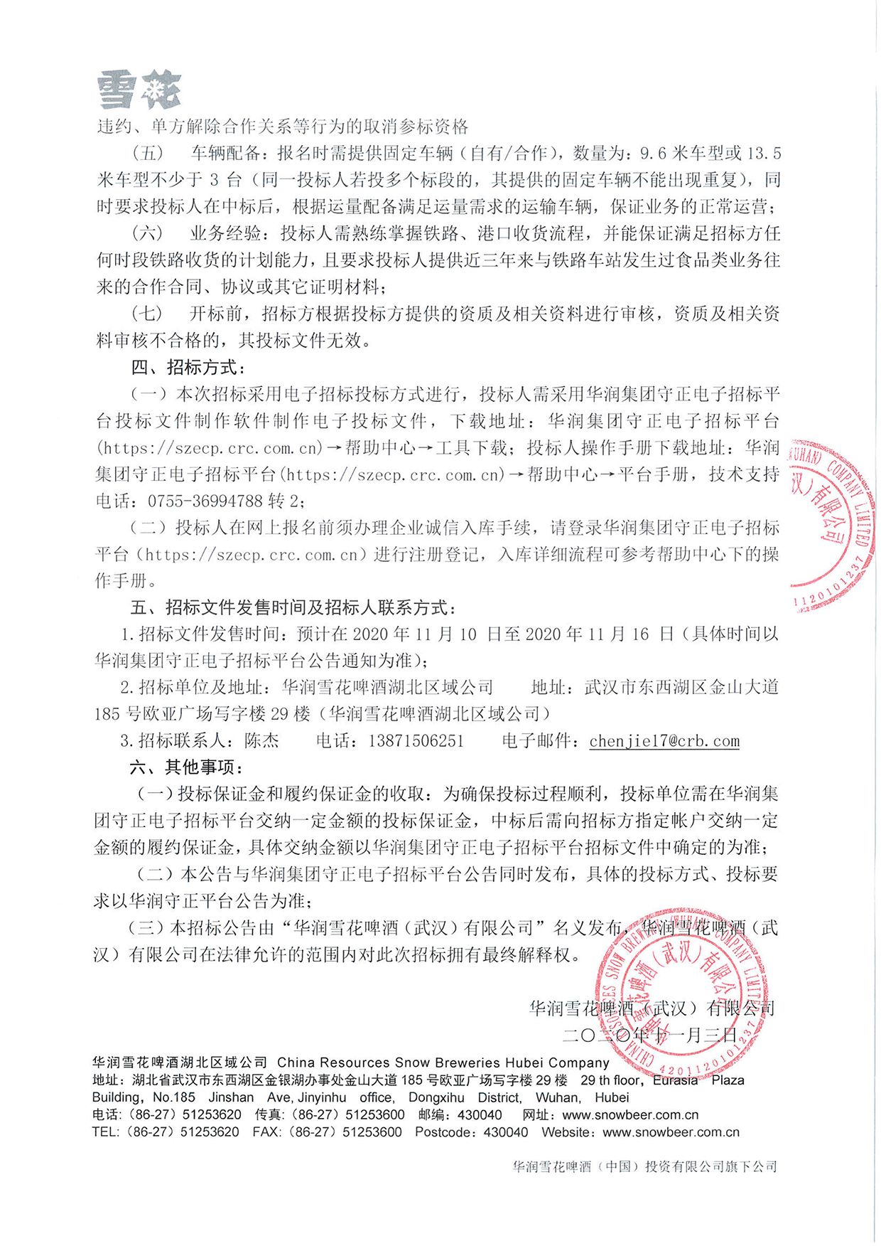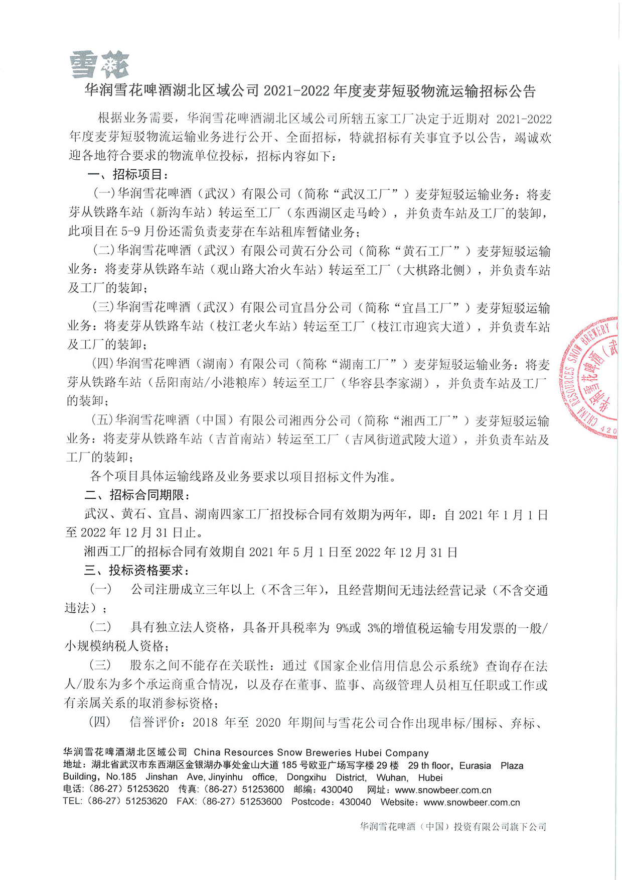 华润雪花啤酒湖北区域公司2021-2022年度麦芽短驳物流运输招标公告