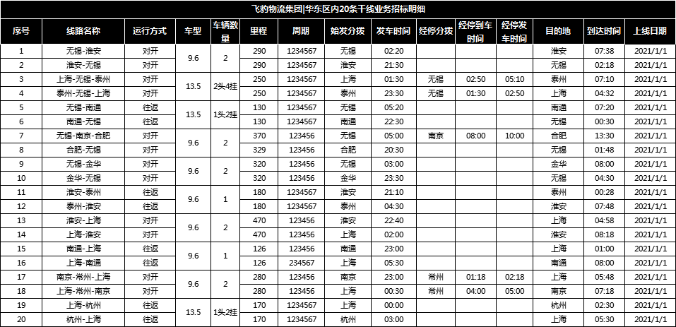 7、车体广告要求:双边、往返业务承运自带车线路的能够接受车头和车厢喷绘飞豹总部品牌处规定的黑色LOGO,并且费用自理。【注】:按最新广告标准制作,中标后请第一时间联系上线对接人员。