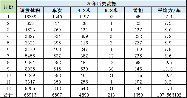 3、2020年发货历史数据:20年共195家店运输,共发出车辆6807车次。共发货体积66913m3。