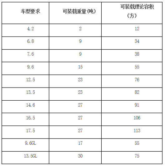 运作车辆须满足以下需求并承诺以下装载量符合GB1589对各车型车货总重的限制。