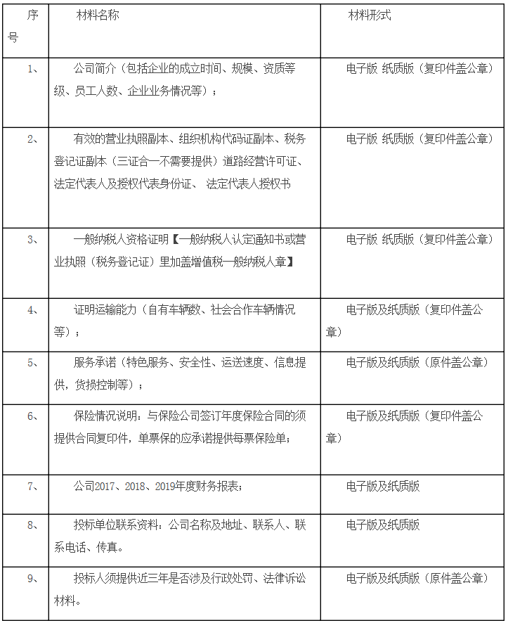 4. 投标人具备开具符合国家货物运输业的增值税开票资质,适用税率 9%。
