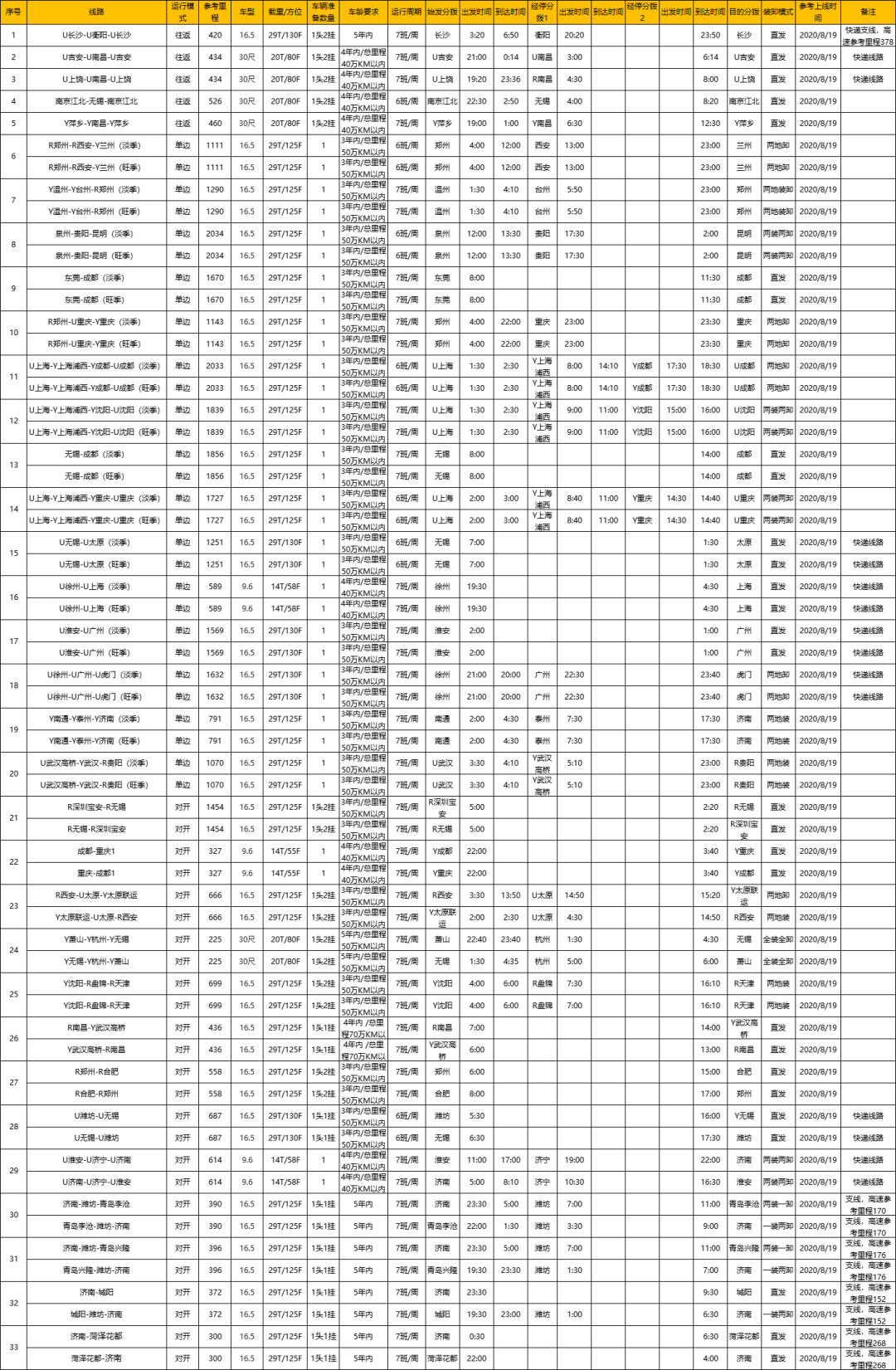 备注-常规车型:快运车辆载重/方位:9.6车型14T/55F,16.5车型29T/125F;