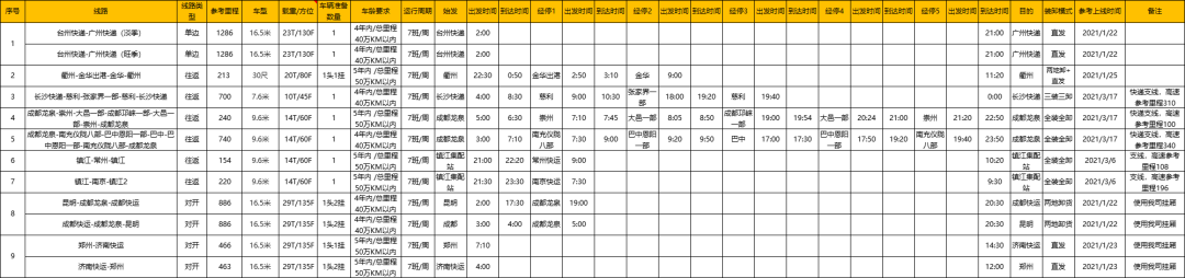 7、快递固定单边线路执行“1+1”保障模式,即合作期限内除第1班外根据实际用车需求要提供2班,且1班与2班同价。