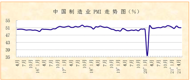 中国物流与采购联合会、国家统计局服务业调查中心发布的2021年5月份中国制造业采购经理指数(PMI)为51%,较上月小幅下降0.1个百分点,连续3个月保持在51%以上水平,表明经济延续平稳恢复势头。分项指数变化显示,月内市场供给保障较好,大中型企业经济支撑作用较强,优质产能继续释放,市场预期较为乐观。但原材料价格加快上涨,导致市场需求增速放缓,行业成本压力加大,小型企业困难增加。