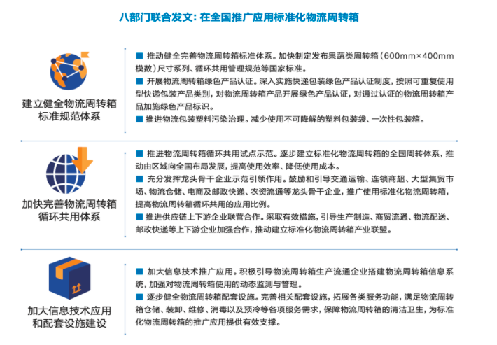 2018年5月,财政部、商务部联合印发《关于开展2018年流通领域现代供应链体系建设的通知》,要求发展单元化流通,提高供应链标准化水平。在适用领域加快推广规格统一、推动包装箱、周转箱(筐)等物流载具标准相衔接。