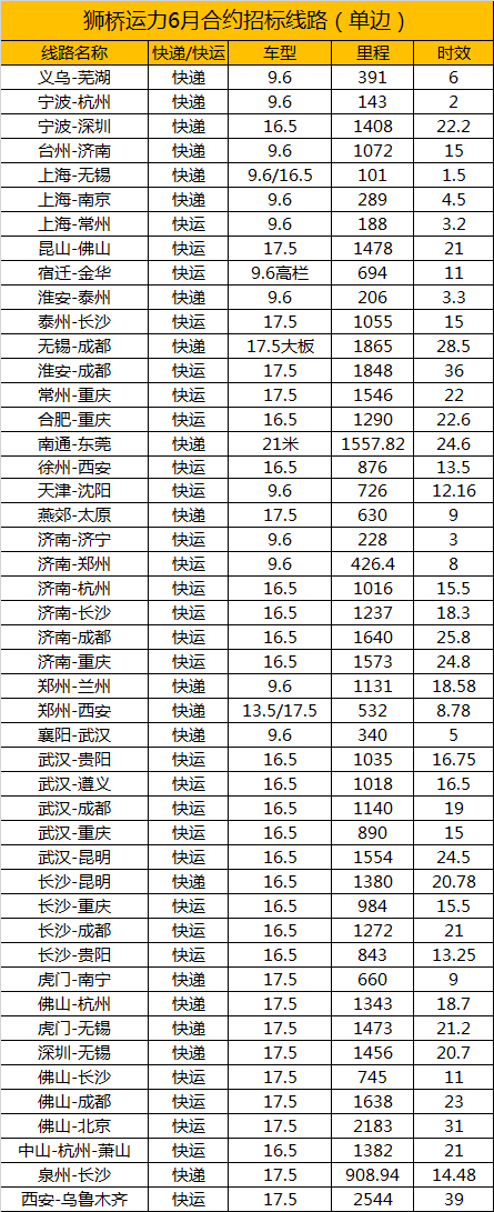 1、线路情况:狮桥运力2020年6月单边线路招标