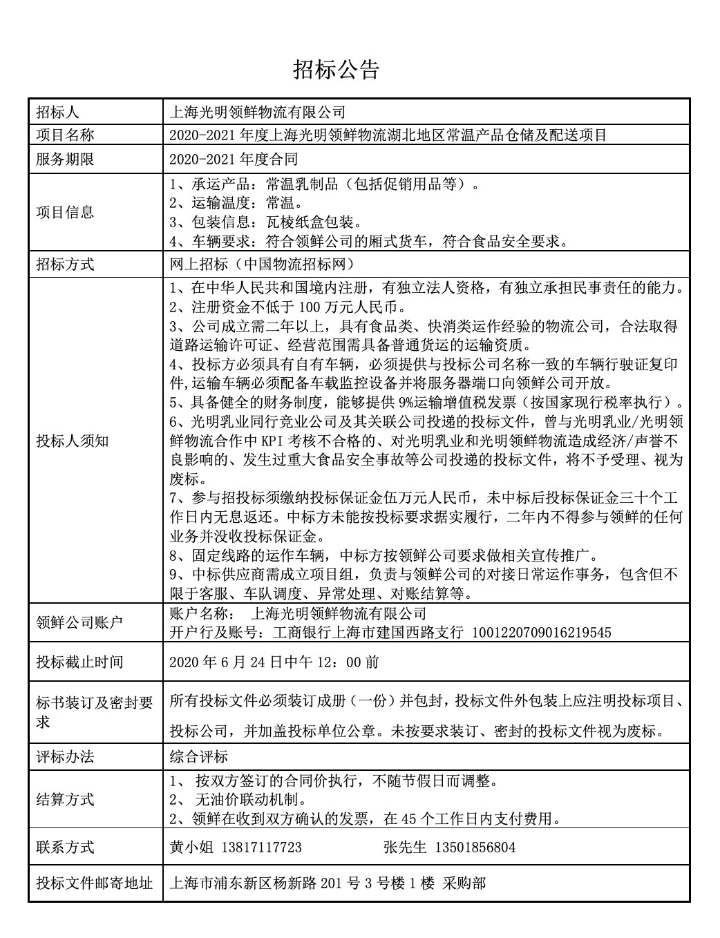 2020-2021年度上海光明领鲜物流湖北常温产品仓储及配送项目招标